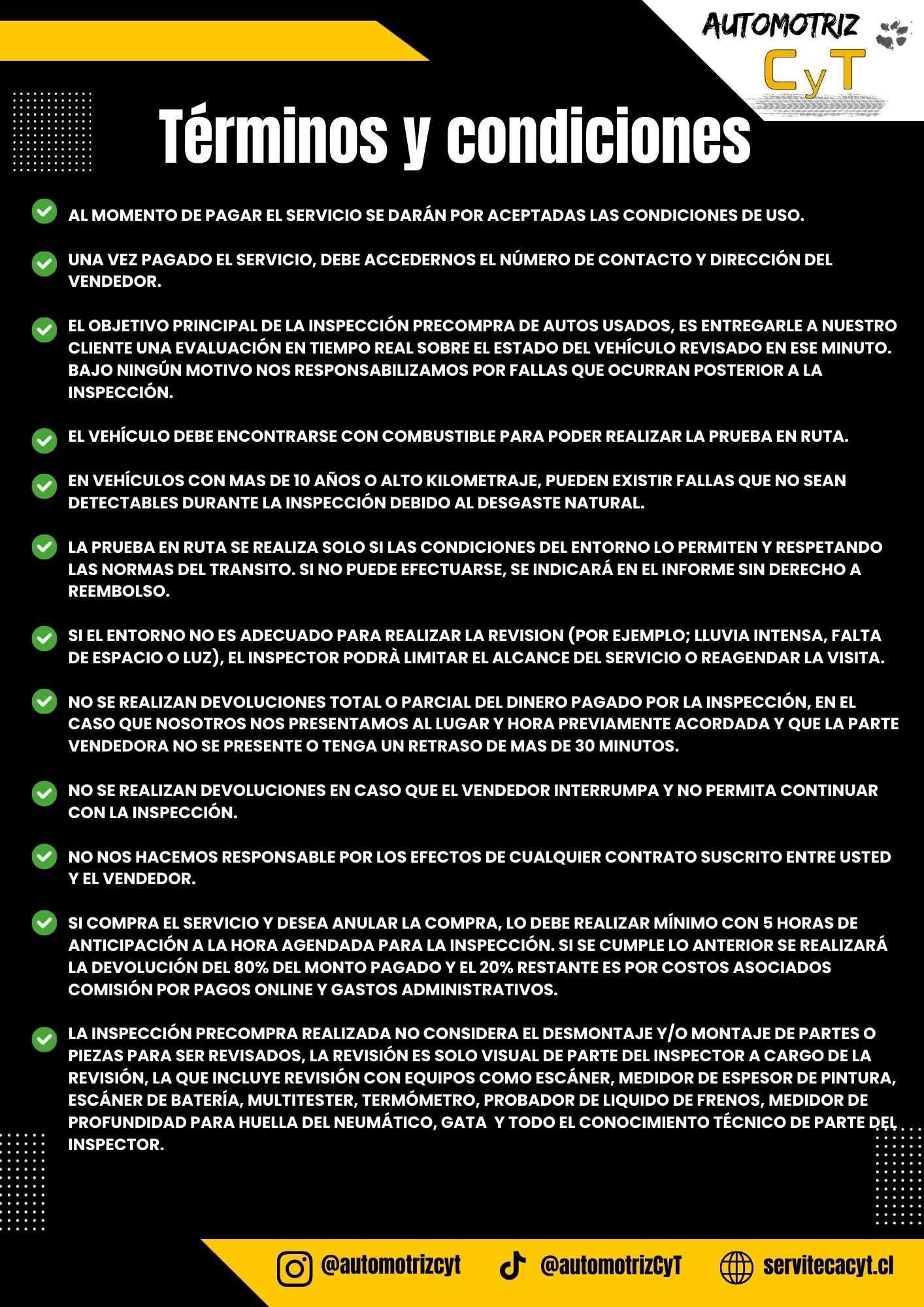 • La inspección precompra realizada no considera el desmontaje y/o montaje de partes o piezas para ser revisados, La revisión es solo visual de parte del inspector a cargo de la revisión, la que incluye revisión con equipos como escáner, medidor de espesor de pintura, escáner de batería, multitester, termómetro y todo el conocimiento tecnico de parte del inspector.